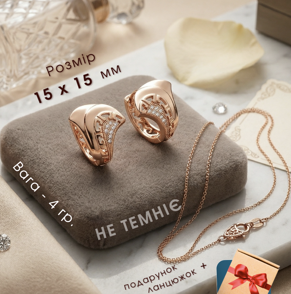 Замовив дружині комплект - сережки та каблучка, ще й ланцюжок у подарунок дали. Дуже задоволена, носить із задоволенням, виглядає стильно й дорого. Позолота не темніє, застібки зручні, не чіпляються. Взяв одразу два комплекти - ще й доставку отримав безкоштовно. Рекомендую!