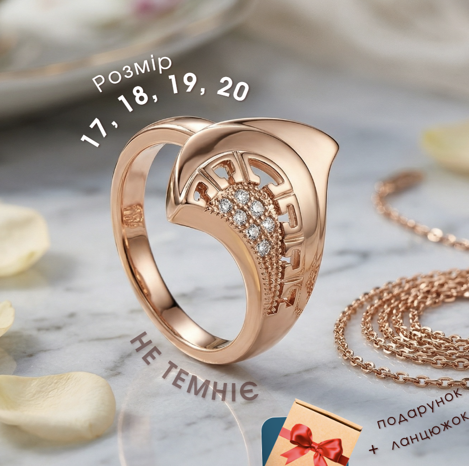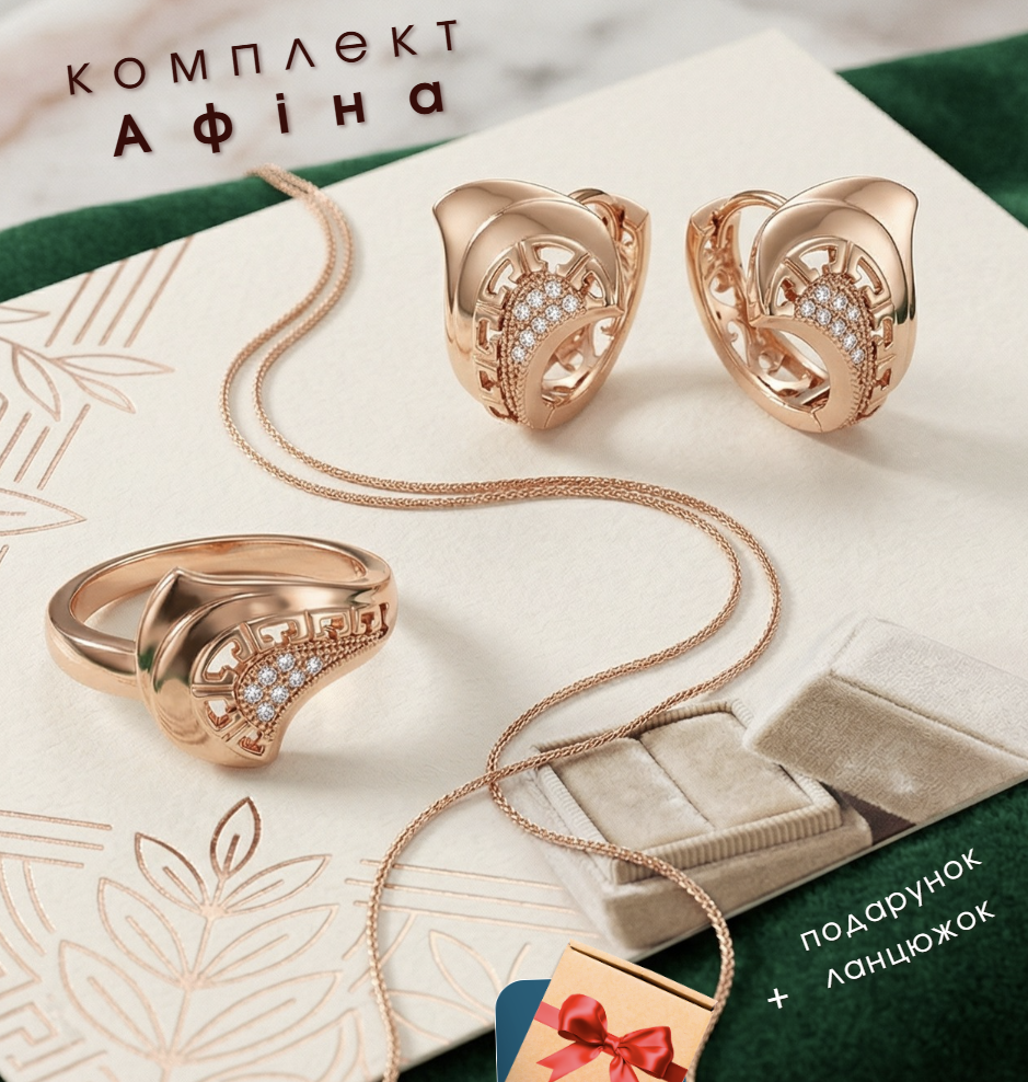 Замовила собі комплект "Афіна" - дуже задоволена покупкою! Сережки легкі, застібка зручна, не натирає і добре тримається. Каблучка гарно виглядає на руці, колір теплий, приємний для ока. Приємно здивував ланцюжок у подарунок - ніжний, акуратний і гарно доповнює весь комплект. Ношу вже кілька тижнів - жодних слідів потемніння чи почорніння.