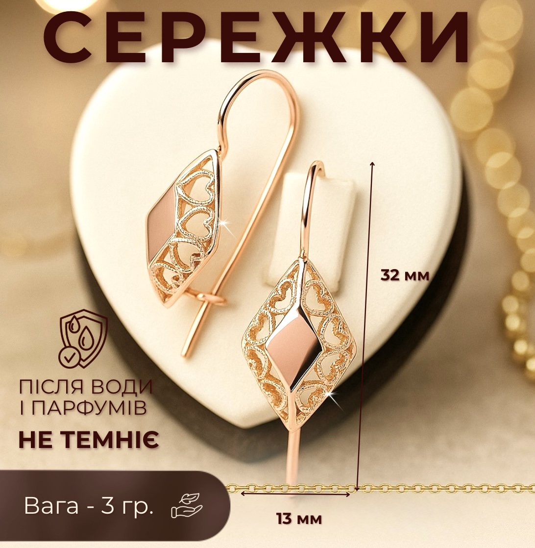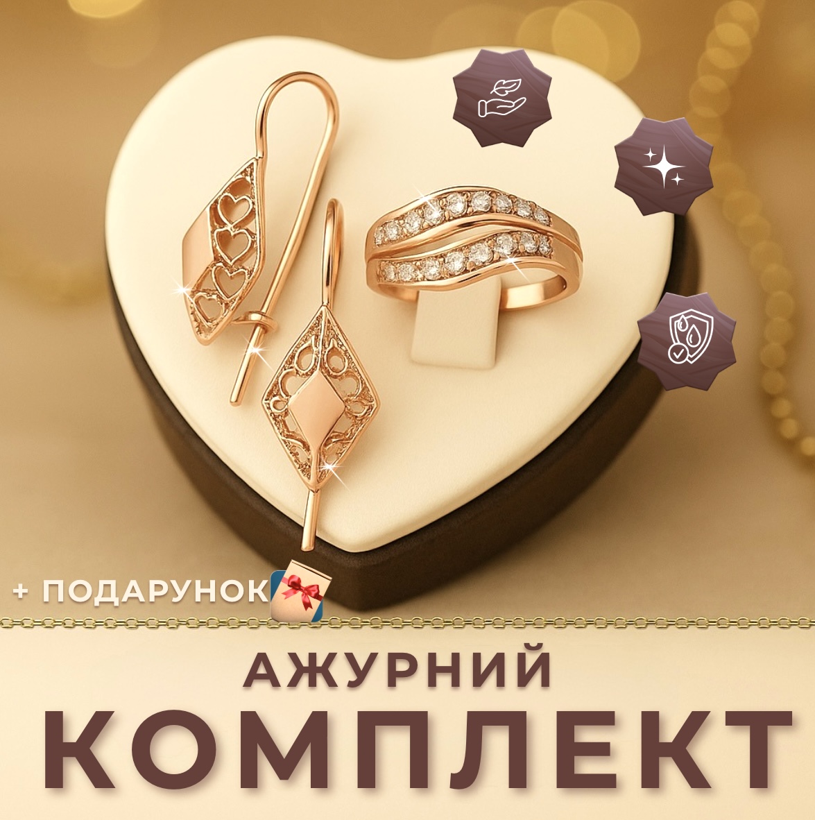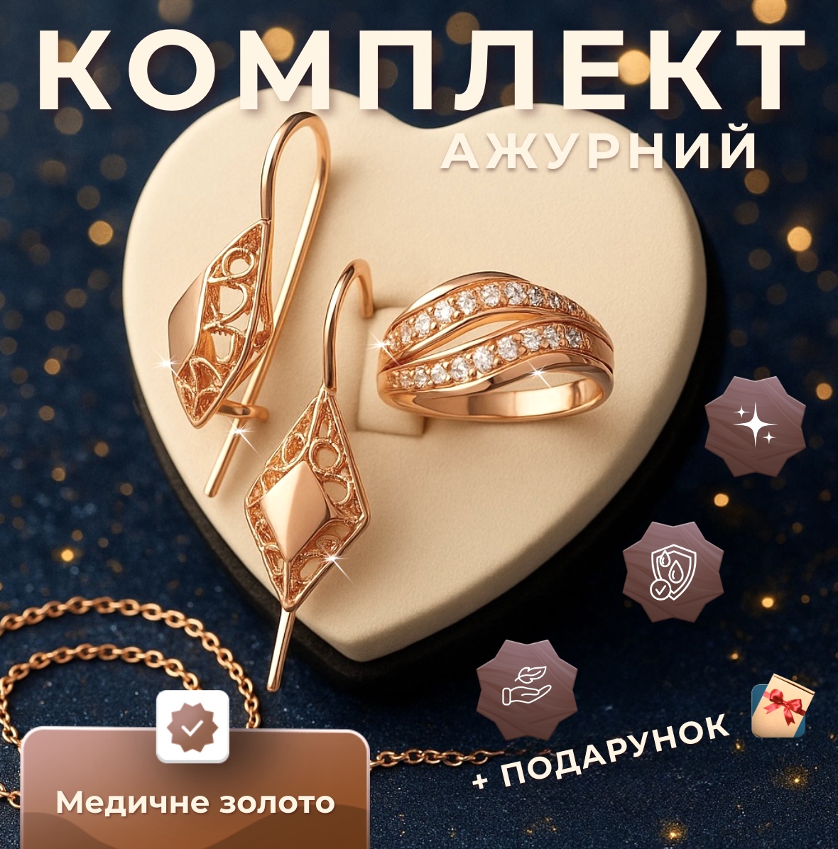 Замовила собі комплект "Ажурний" - дуже задоволена покупкою! Сережки легкі, застібка зручна, не натирає і добре тримається. Каблучка гарно виглядає на руці, колір теплий, приємний для ока. Приємно здивував ланцюжок у подарунок - ніжний, акуратний і гарно доповнює весь комплект. Ношу вже кілька тижнів - жодних слідів потемніння чи почорніння.
