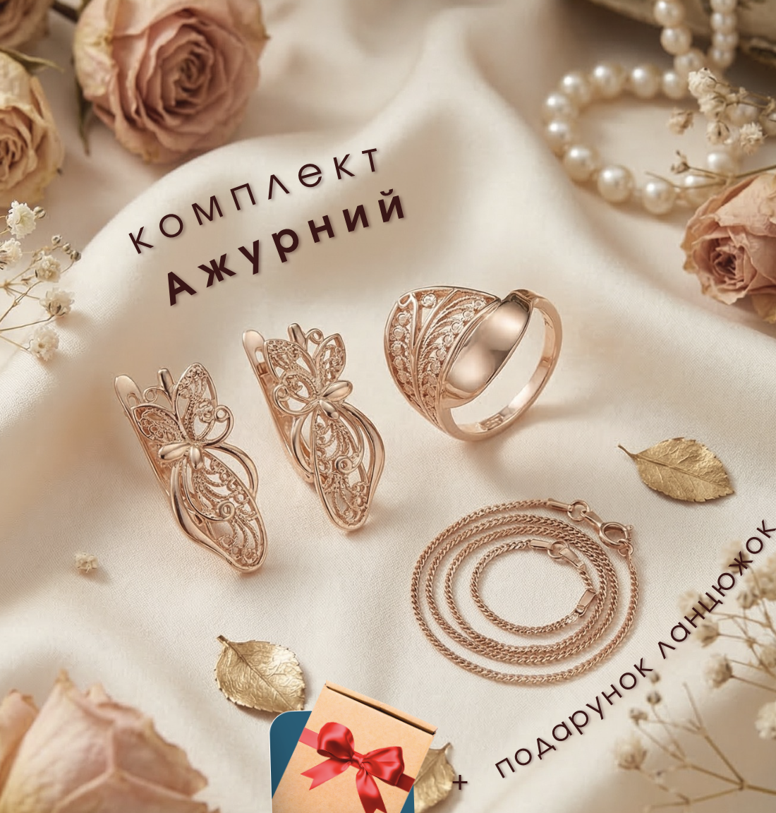 Замовила собі комплект "Ажурний" - дуже задоволена покупкою! Сережки легкі, застібка зручна, не натирає і добре тримається. Каблучка гарно виглядає на руці, колір теплий, приємний для ока. Приємно здивував ланцюжок у подарунок - ніжний, акуратний і гарно доповнює весь комплект. Ношу вже кілька тижнів - жодних слідів потемніння чи почорніння.