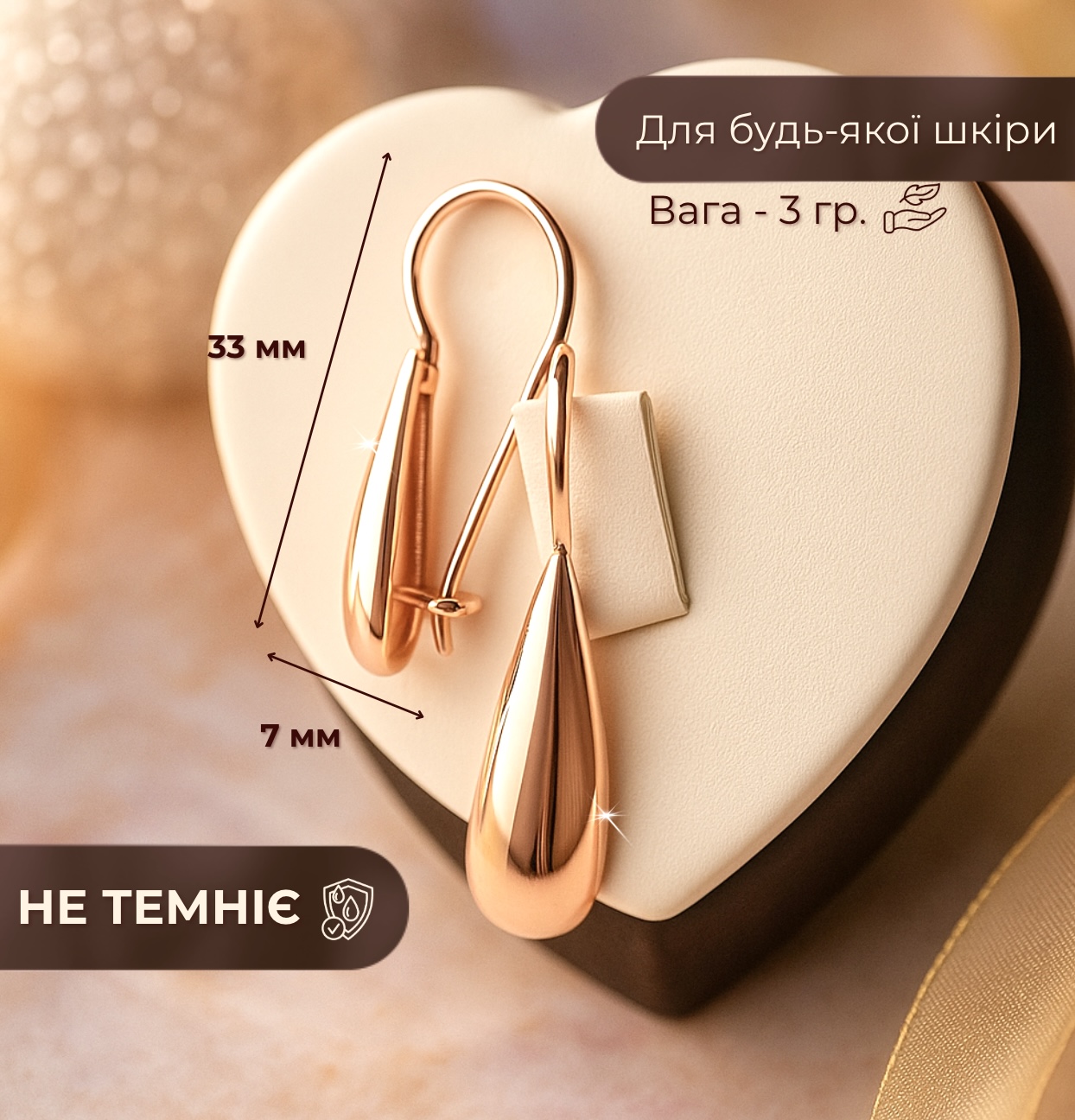 Замовила собі комплект "Капля" - дуже задоволена покупкою! Сережки легкі, застібка зручна, не натирає і добре тримається. Каблучка гарно виглядає на руці, колір теплий, приємний для ока. Приємно здивував ланцюжок у подарунок - ніжний, акуратний і гарно доповнює весь комплект. Ношу вже кілька тижнів - жодних слідів потемніння чи почорніння.