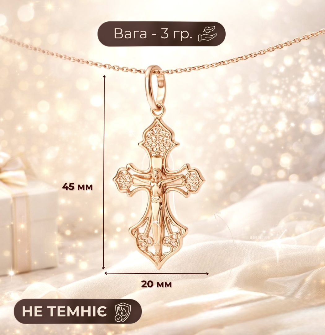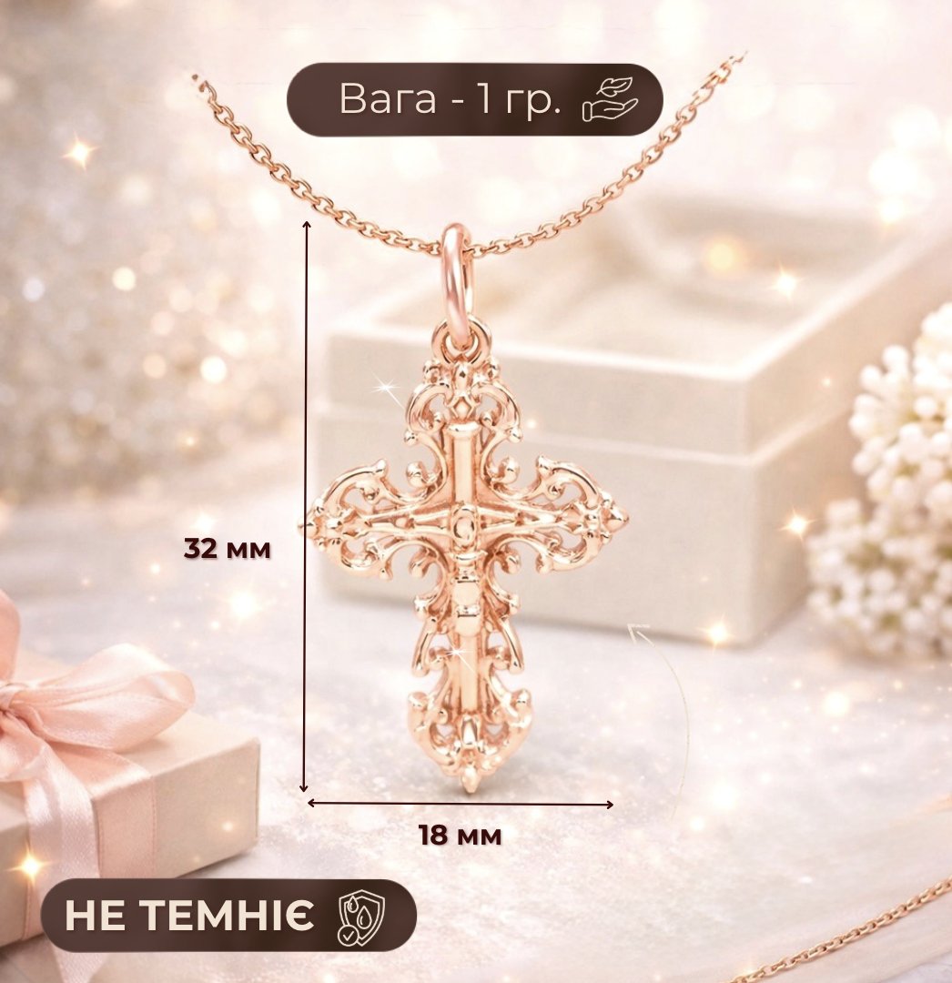 Замовила собі хрестик - дуже задоволена покупкою! Кулон легкий, застібка зручна, не натирає і добре тримається. Приємно здивував ланцюжок у подарунок - ніжний, акуратний і гарно доповнює увесь кулон. Ношу вже кілька тижнів - жодних слідів потемніння чи почорніння.