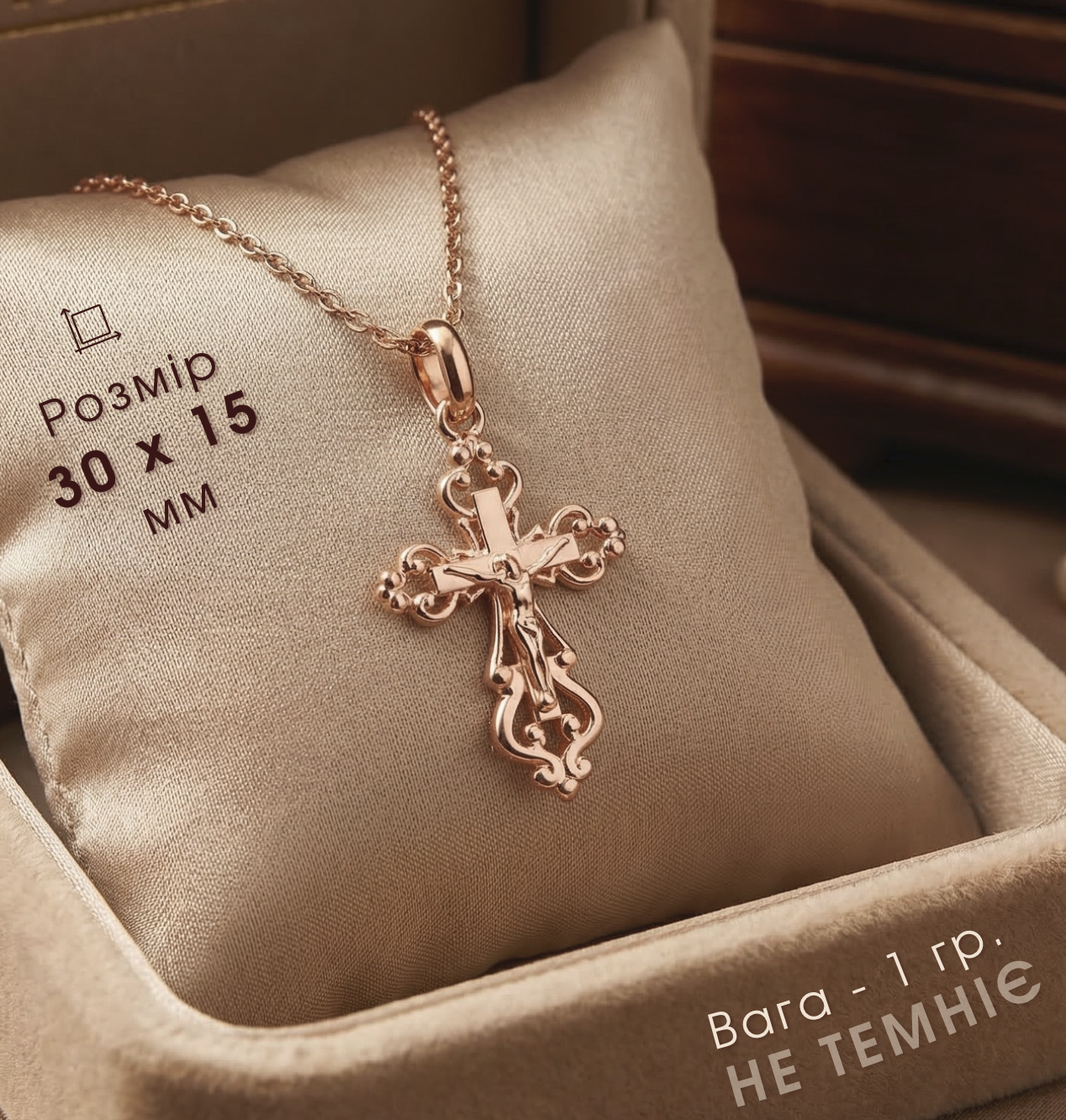 Замовив дружині хрестик - ще й ланцюжок у подарунок дали. Дуже задоволена, носить із задоволенням, виглядає стильно й дорого. Позолота не темніє, застібки зручні, не чіпляються. Взяв одразу дві шт - ще й доставку отримав безкоштовно. Рекомендую!