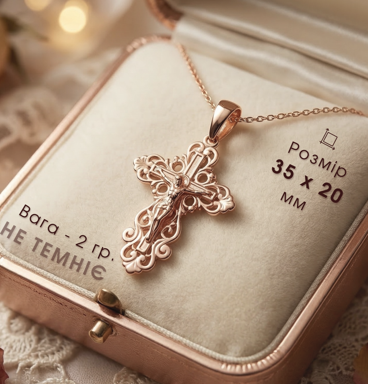Замовила собі хрестик - дуже задоволена покупкою! Кулон легкий, застібка зручна, не натирає і добре тримається. Приємно здивував ланцюжок у подарунок - ніжний, акуратний і гарно доповнює увесь кулон. Ношу вже кілька тижнів - жодних слідів потемніння чи почорніння.
