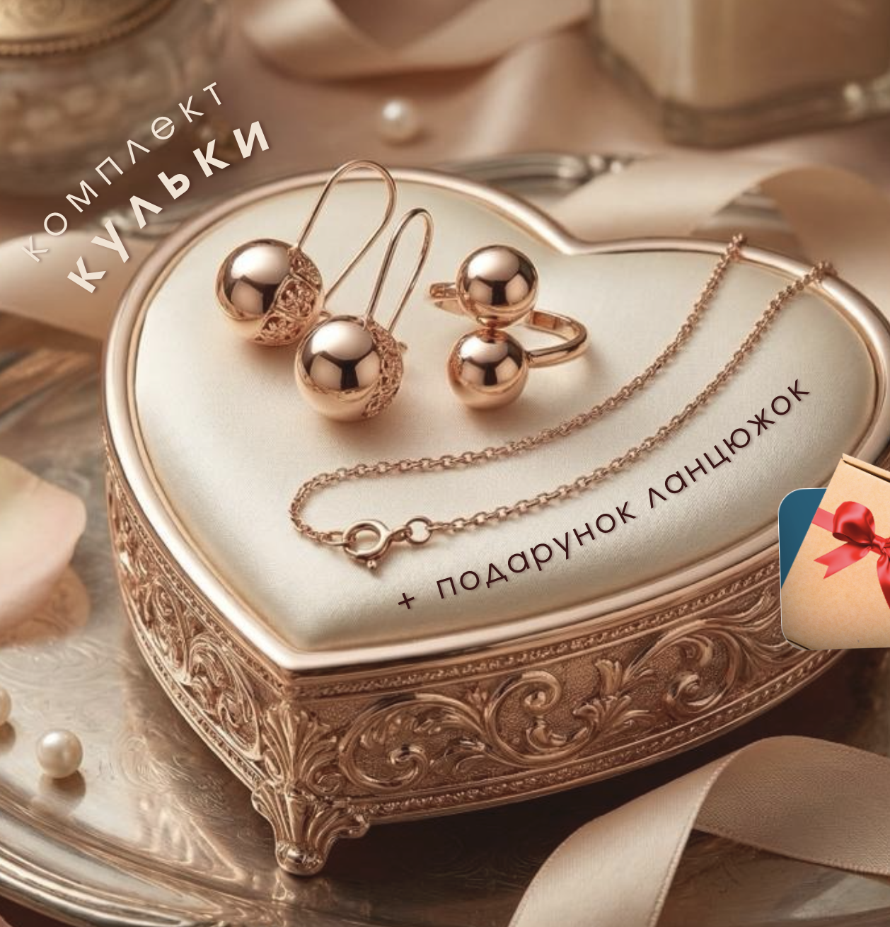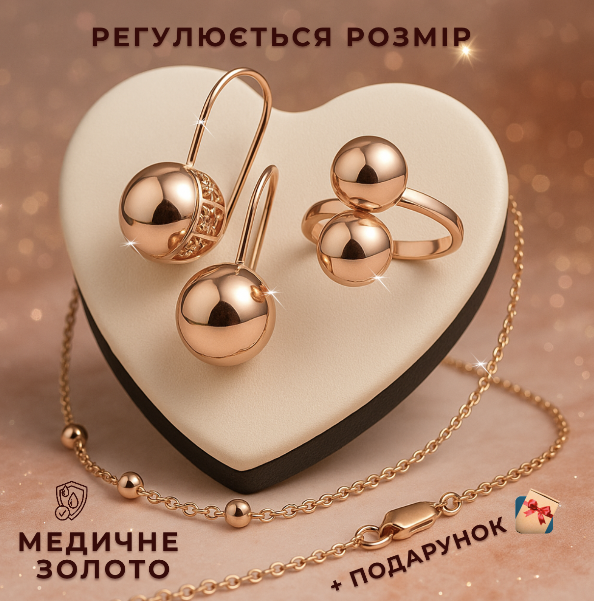 Замовила собі комплект "Кульки" - дуже задоволена покупкою! Сережки легкі, застібка зручна, не натирає і добре тримається. Каблучка гарно виглядає на руці, колір теплий, приємний для ока. Приємно здивував ланцюжок у подарунок - ніжний, акуратний і гарно доповнює весь комплект. Ношу вже кілька тижнів - жодних слідів потемніння чи почорніння.