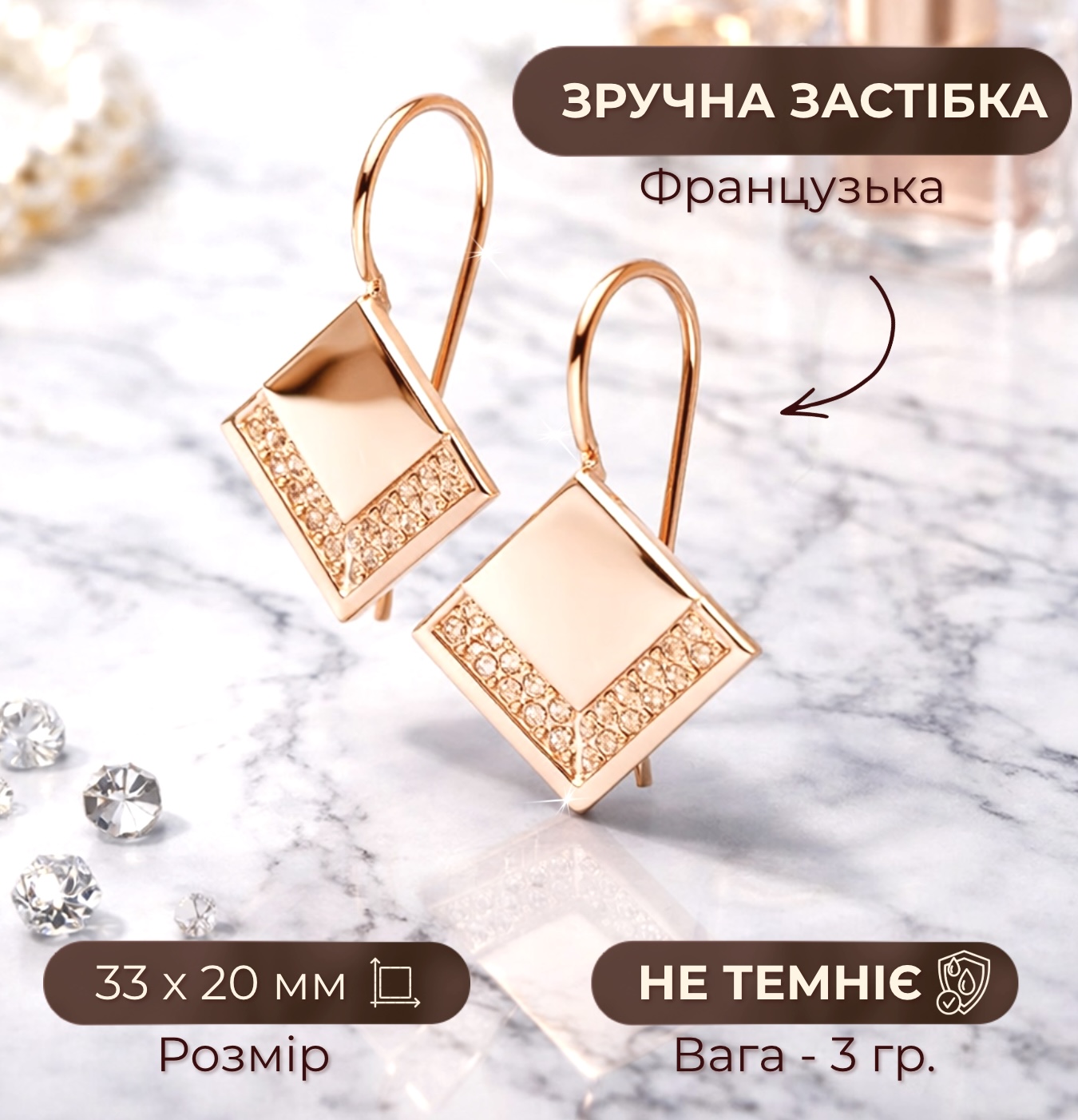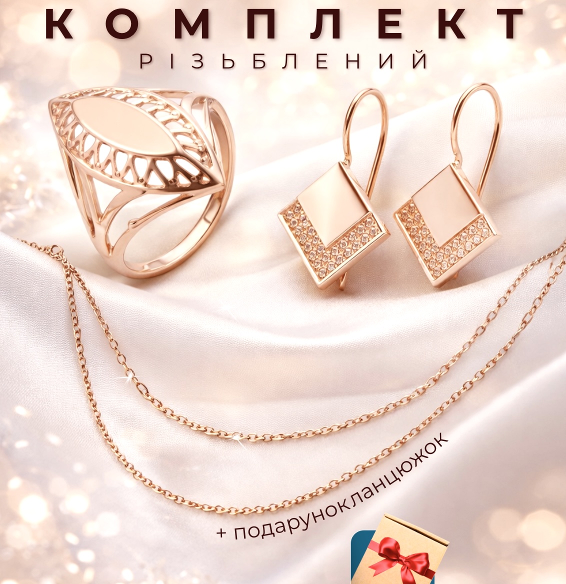 Замовив дружині комплект - ще й ланцюжок у подарунок дали. Дуже задоволена, носить із задоволенням, виглядає стильно й дорого. Позолота не темніє, застібки зручні, не чіпляються. Взяв одразу дві шт - ще й доставку отримав безкоштовно. Рекомендую!