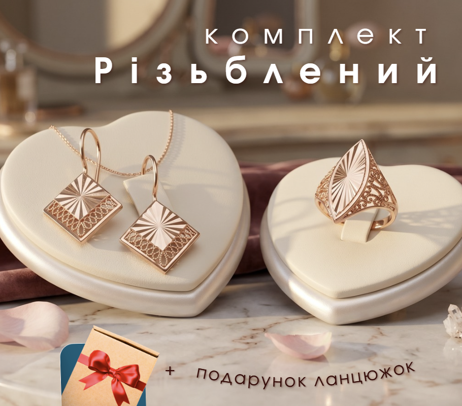 Замовила собі комплект "Різьблений" - дуже задоволена покупкою! Сережки легкі, застібка зручна, не натирає і добре тримається. Каблучка гарно виглядає на руці, колір теплий, приємний для ока. Приємно здивував ланцюжок у подарунок - ніжний, акуратний і гарно доповнює весь комплект. Ношу вже кілька тижнів - жодних слідів потемніння чи почорніння.